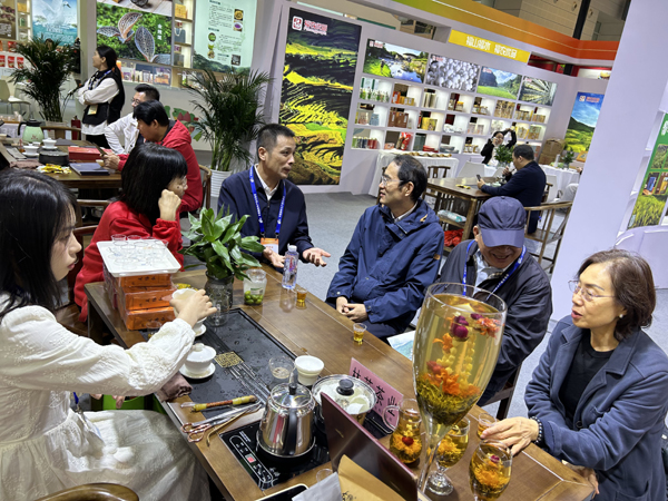 图为福建省绿色食品发展中心曾晓勇主任一行在林芝展位上指导工作